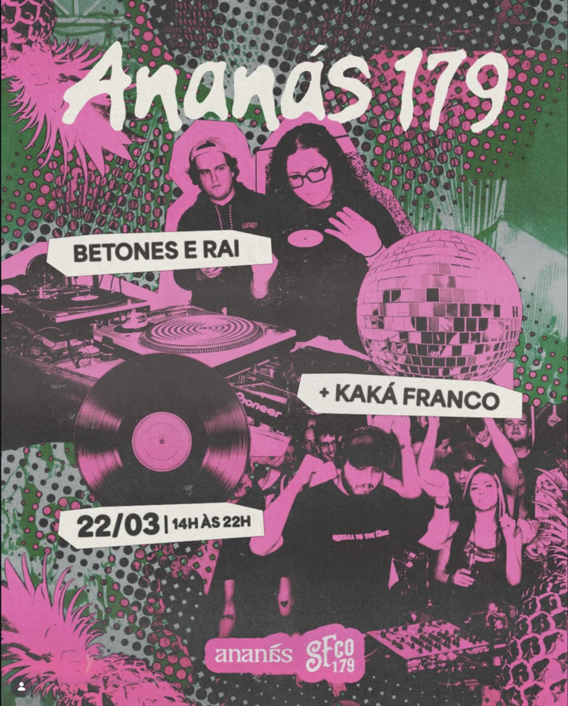 Pra celebrar o House em sua melhor forma, o Ananás 179 – sob o comando do DJ Kaká Franco – tem com missão te tirar do sofá, nas tardes de domingo, pra trazer pra pista, pra te trazer pro grande groove.